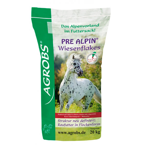 PRE ALPIN WIESENFLAKES ist ein neues Produkt aus dem Hause Agrobs, das durch innovative Herstellungsverfahren ein qualitativ hochwertiges, einfach zu fütterndes Raufutterprodukt darstellt. PRE ALPIN WIESENFLAKES sind ein idealer Heuersatz. Die flockenähnliche Darreichungsform ermöglicht eine unkomplizierte Fütterung, als Beifutter zur Ration Grundfutter oder zum Untermischen in das vorhandene Krippenfutter. Das Krippenfutter erhält somit mehr Struktur und die tägliche Aufnahme des Pferdes an hochwertiger Rohfaser erhöht sich. Gleichzeitig muss das Pferd vermehrt kauen und wird dadurch zu einer langsameren Futteraufnahme angehalten. Die zudem erhöhte Speichelproduktion führt zu einer verbesserten Verdauung des Krippenfutters und dient gleichzeitig zur Aufrechterhaltung einer gesunden Darmflora.