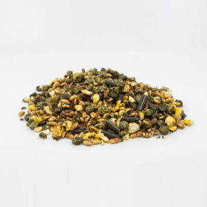 Mais flockiert, Weizenkleie, Gerste flockiert, Luzernegrünmehl, Apfeltrester, Rübentrockenschnitzel, Gerste gepoppt, Rübenmelasse, Gerste, Apfeltrester, Sojabohnen (getoastet), Calciumcarbonat, Grashäcksel getrocknet, Leinsaat extrudiert, Sonnenblumenkerne, Luzernestängel, Mais gepoppt, Natriumchlorid, Monocalziumphosphat, Weizen, Sojaöl, Magnesiumoxyd