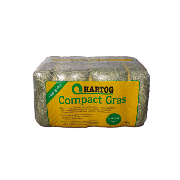 Hartog Compact Gras enthält 100 % getrocknetes Gras ohne Zusätze. Es wird in einem Kleinballen mit einer Abmessung von 50 x 30 x 30 cm gepresst. Dieser handliche Ballen wird für eine saubere Lagerung und leichten Transport in einer schützenden Folie verpackt. Kurzum: ein idealer Ersatz für den traditionellen Heuballen. 100 % getrocknetes Gras Staubarm und schimmelfrei, weniger Lagerraum nötig, mit schützender Folie, garantiert frei von Jakobskreuzkraut