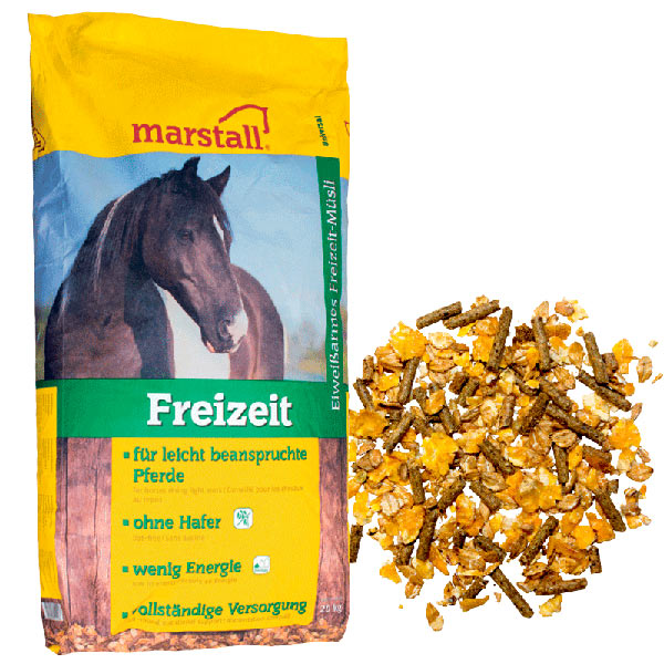 marstall Freizeit ist ein kostengünstiges, universell einsetzbares Müsli, das auf hydrothermisch aufgeschlossenen und damit leicht verdaulichen Getreideflocken basiert. Sein niedriger Energie- und Eiweißgehalt und der hohe Anteil an Rohfaser sind ideal für die bedarfsgerechte Fütterung gering beanspruchter Pferde. Alle wichtigen Vitamine, Mineralien und Spurenelemente sind enthalten und optimal auf die Bedürfnisse von Freizeitpferden abgestimmt.