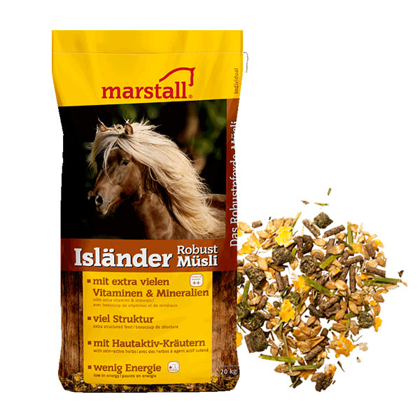 marstall Isländer Robust-Müsli wurde speziell für leichtfuttrige Rassen und Pferde in Robusthaltung entwickelt. Die ausgewogene Rezeptur sichert die gesunde Versorgung mit allen Nähr- und Wirkstoffen in hoher Verfügbarkeit.