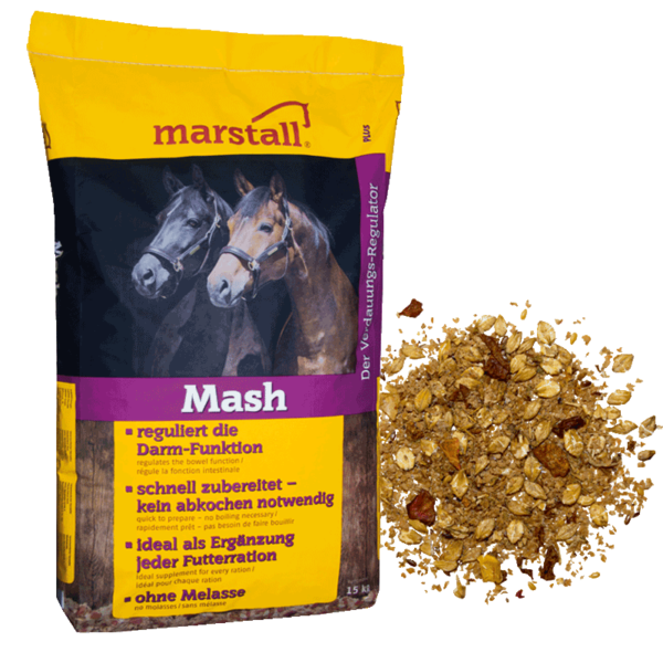 marstall Mash ist die praktische Mischung für eine gesunde Verdauung und schönen Fellglanz. Die Rezeptur basiert auf altbewährten ursprünglichen Zutaten, wurde jedoch konsequent weiterentwickelt. marstallMash wirkt appetit- und verdauungsanregend und ist deshalb auch eine ideale Wahl bei schwerfuttrigen Pferden. Senioren profitieren von der breiartigen Konsistenz. Besonders geeignet ist der Einsatz von marstall Mash als Aufbaufutter bei Pferden nach körperlichen und psychischen Stressphasen. Das Plus: Die leichte Zubereitung mit kurzer Quellzeit – ganz ohne Kochen!