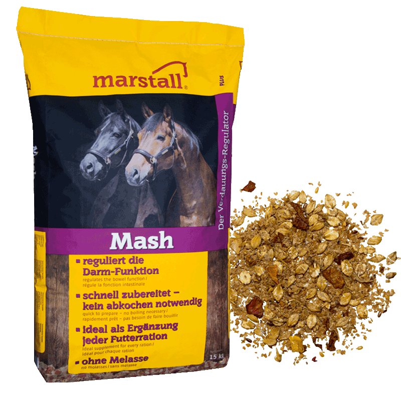 marstallMash ist die heiß geliebte Mahlzeit für Pferde in besonderen Lebenssituationen oder als alternatives warmes Schmankerl. Gerade bei Verstopfung, nach Wurmkuren, Operationen oder Geburt sowie bei Wetterumschwüngen, Futterumstellung, während des Fellwechsels oder sonstigen Stresssituationen ist die Gabe von marstall Mash empfehlenswert und sinnvoll. Denn die leicht verdauliche Mischung regt den Appetit, die Darmfunktion und den Stoffwechsel an und sorgt nebenbei dank mehrfach ungesättigten Fettsäuren für wunderschönen Fellglanz.