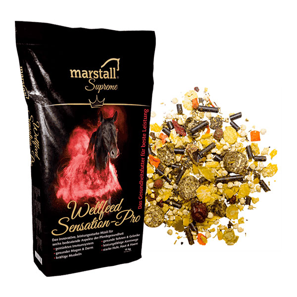 marstall Sensation-Pro ist ein neuartiges Futter für Pferde, die im Sport und bei der Arbeit Leistung bringen. Als getreidehaltiges Sportmüsli liefert es viel Energie, enthält aber vergleichsweise wenig Stärke, was die Verdauung schont. Es deckt optimal den Bedarf an Vitaminen und Mineralstoffen und braucht keine Melasse als Geschmacksträger. marstall Sensation-Pro unterstützt die Gesunderhaltung Ihres Pferdes in den Bereichen Immunsystem, Magen & Darm, Muskulatur, Sehnen & Gelenke, Atemwege, Hufe, Haut & Haare – für ein langes und vitales Leben