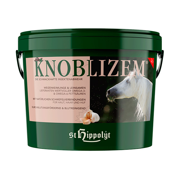 Knoblizem®, die beliebte Futterergänzung für insektengeplagte Weidepferde ist eine gelungene Kombination aus Knoblauch bester Qualität, Kräutern wie Rosmarin, Pfefferminze, Koriander sowie Vitaminen des B-Komplexes. Mit Knoblizem® steht dem Pferd eine ausgewogene und nicht zu scharfe Knoblauchquelle zur Verfügung. Weizenkeime und Leinsamen liefern natürliches Vitamin E, Verdauungsenzyme und wertvolle essentielle Fettsäuren.