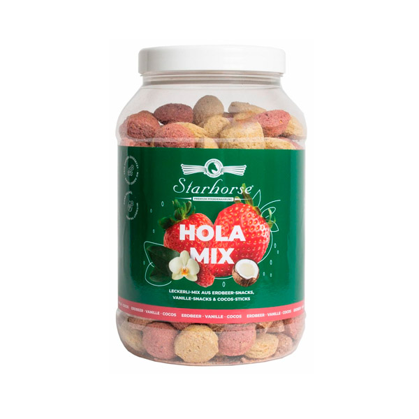 Der Starhorse Hola-Mix, aus 3 köstlichen Sorten Leckerli (Erdbeer-Snacks, Vanille-Snacks, Cocos-Sticks), ist die ideale Belohnung für jedes Pferd. Ausgewählte, hochwertige Zutaten, sowie natürliche Aromen verleihen dem Produkt seine hervorragende Qualität, den besonderen Geschmack, und sorgen mit drei verschiedenen Geschmacksrichtungen für mehr Abwechslung beim Füttern.
