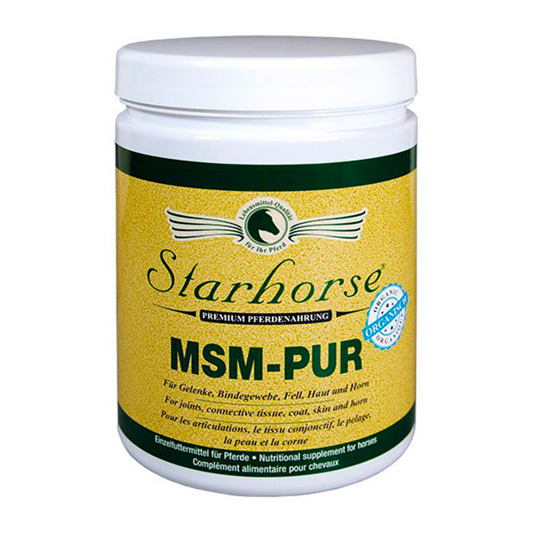 MSM-PUR von Starhorse besteht aus einer leicht verfügbaren, rein organischen Schwefelverbindung (34% Methylsulfonylmethan). MSM-Pur schützt hervorragend vor Mangelerscheinungen dieses für Pferden besonders lebenswichtigen Elements.