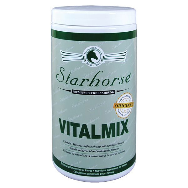Starhorse Vitalmix ist ein hochwertiges Ergänzungsfuttermittel mit Aminosäuren, Vitaminen, Mineralstoffen, Spurenelementen und Enzymen. Alle Rohstoffe entsprechen zertifizierter Lebensmittelqualität und können daher vom Pferdeorganismus bestens aufgenommen und verwertet werden. Ausreichend enthaltene Aminosäuren, erfüllen die Aufgaben im Bereich der Muskel- u. Zellbildung. Enzyme unterstützen den Verdauungsprozess, Lezithin wirkt sich positiv auf Ausdauerfähigkeit und Regeneration aus, Phospholipide sind wichtige Bestandteile aller Zellmembranen. Meeresalgenpulver und die Chlorella-Alge im speziellen versorgt das Pferd mit rein natürlichen Spurenelementen sowie Mineralstoffen und unterstützen in ihrer Zusammenwirkung die Entgiftung des Pferdeorganismus. Die Inhaltsstoffe von Starhorse Vitalmix sind ganzheitlich aufeinander abgestimmt, was wiederum bedeutet, dass jeder Inhaltstoff seinen synergetisch abgestimmten Copartner zur Verfügung hat. Im Gegensatz zu herkömmlichen Produkten besteht so ein geringerer Bedarf an jedem einzelnen Vitalstoff, da die Bioverfügbarkeit wesentlich höher ist und eventuell vorhandene Nährstoffdefizite dadurch leichter ausgeglichen werden können.